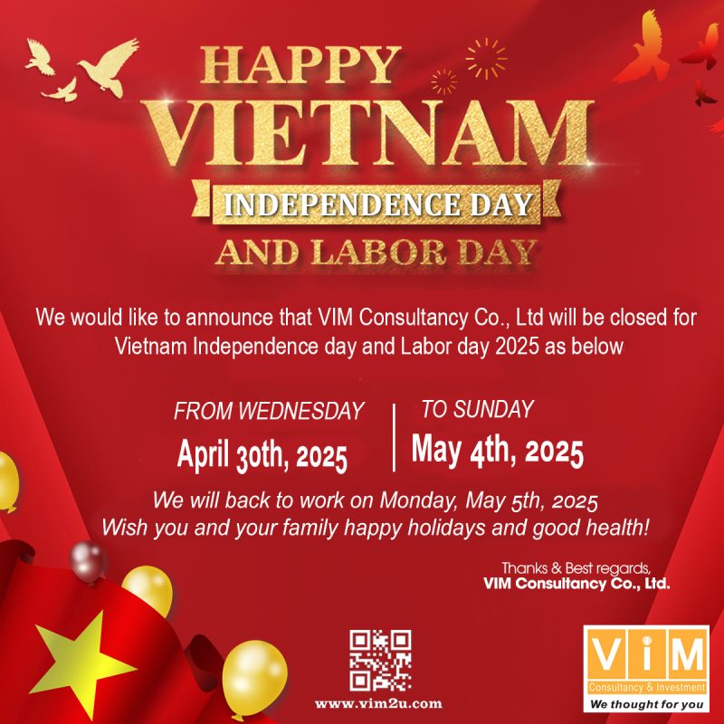 We would like to announce that VIM Consultancy Co.,Ltd will be closed for Vietnam Independence day and Labor day 2025 as below:
